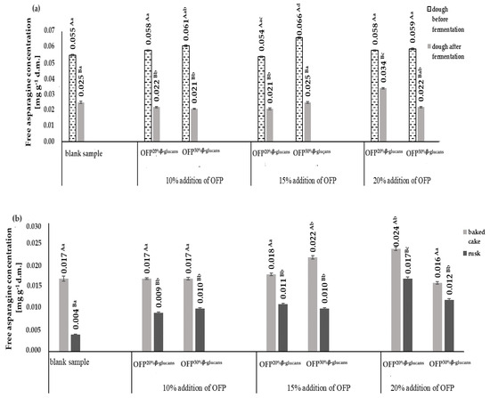 The contents of free asparagine in the raw yeast doughs ranged from 0.054 mg g−1 d.m. up to 0.066 mg g−1 d.m. The highest content of free asparagine was found in the raw yeast dough obtained with 15% OFP30% β-glucans, while the lowest content was in the dough obtained with 15% OFP20% β-glucans. The content of free asparagine decreased as a result of the fermentation of the yeast dough (on average by 58.0%). The greatest reduction (65.0%) in the free asparagine content during the fermentation process was observed in the dough with 10% OFP30% β-glucans, while the lowest (41.0%) was in the dough with 20% OFP20% β-glucans (Figure 2a). These results are correspondent with the findings of Fredriksson et al. [26], who in their studies monitored the content of free asparagine in bread dough subjected to the fermentation process with yeast. The authors observed a 40.0% reduction in the content of free asparagine in the dough subjected to a 1 h fermentation process. In the dough fermentation process, free asparagine is the main source of nitrogen necessary for yeast growth.