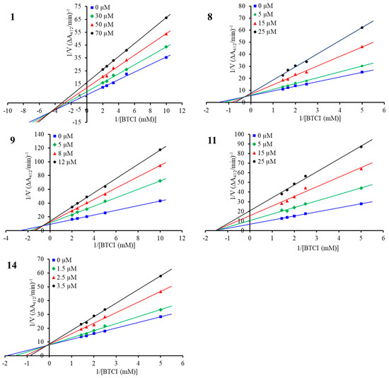 Lineweaver–Burk plot for BChE inhibition by compounds 1, 8, 9, 11, and 14.