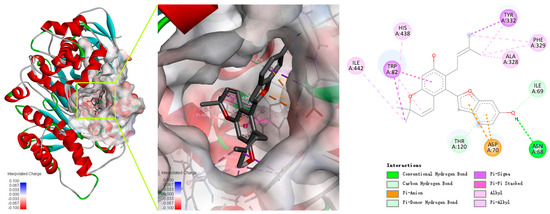 Cathafuran C (14) potently inhibits BChE in a competitive manner and with quite high selectivity. The interaction modes of the inhibitor with the enzymes were investigated using Autodock Vina software in Yinfo Cloud Platform (http://cloud.yinfotek.com/) to better understand the capacity and mechanism regarding 14 binding with BChE. As a result, 14 could successfully insert itself into the binding groove of BChE, forming several kinds of interactions with the residues of the enzyme (Figure 5). The amino acid residue Trp82 engages in a π–π stacked interaction, a π–σ interaction, and a π–alkyl interaction with the benzyl ring, the methyl group, and the pyran ring of the α-chromene group; the methyl group of the α-chromene group also engages in alkyl interactions with His438 and Ile442. The linear isopentenyl engages in a π–σ interaction with Tyr332 and π–alkyl or alkyl interactions with Ala328 and Phe329. The hydroxyl on the benzofuran ring interacts with Asn68 via a conventional hydrogen bond and with Ile69 via a carbon hydrogen bond. Additionally, the benzofuran ring engages in a π–anion interaction with Asp70 and forms a π–donor hydrogen bond with Thr120.