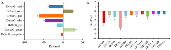 Molecular dynamic simulation results regarding the binding of BChE to compound 14. Total binding free energy and its component for 14 with 5k5e (A); residue contribution to receptor–ligand complexes for 5k5e with 14 (B).