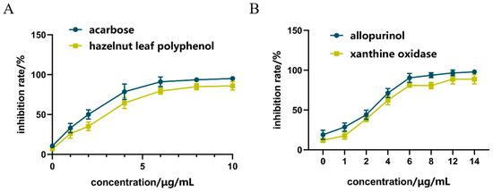 As shown in Figure 2A, compared with acarbose in the positive control group, the inhibitory effect of hazel leaf polyphenol extract increased from 0.59% to 82.86% in the concentration range of 0–10 μg/mL, and the inhibitory effect gradually reached the maximum value at 8 μg/mL. The IC50 of hazel leaf polyphenol extract was 0.3886 nM, which was higher than the control value of 0.2158 nM. These results suggested that hazel leaf polyphenol extract has a good inhibitory effect on α-GLU, but not as good as that of acarbose.