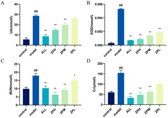 Effects of ZP on UA, XOD, BUN and Cr in hyperuricaemic zebrafish, (A) UA level; (B) XOD level; (C) BUN level; (D) Cr level, ## p < 0.01 compared to control group. * p < 0.05, ** p < 0.01 compared to model group.