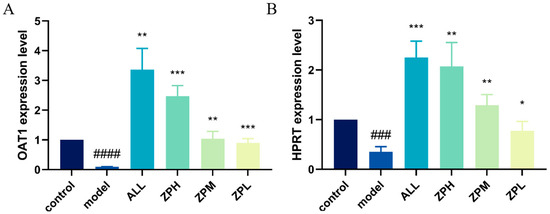 Effects of ZP on the expression of genes OAT1 and HPRT1 in hyperuricemia zebrafish, (A) OAT1 gene; (B) HPRT gene, ### p < 0.001, #### p < 0.0001 compared to control group. * p < 0.05, ** p < 0.01, *** p < 0.001 compared to model group.