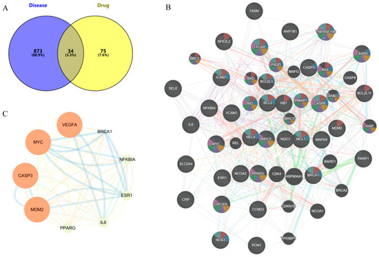The intersection targets were imported into the STRING database to build the initial PPI network. As shown in Figure 5B, the PPI network had 34 targets, 34 nodes, and 289 edges, with an average node degree of 17, local clustering coefficient of 0.779, and PPI enrichment p-value < 1.0 × 10−16. The core targets VEGFA, MYC, CASP3, MDM2, PPARG, IL-6, ESR1, NF-ĸB, and BRCA1 were identified by Cytoscape 3.9.0 visualization (Figure 5C).