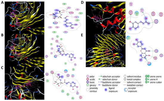 The 3D (left) and 2D (right) binding conformations between the ZP key active ingredient and the core target, (A) Chlorogenic acid-BRCA1 (Conformation 1), (B) Chlorogenic acid-BRCA1 (Conformation 2), (C) Chlorogenic acid-NFKBIA, (D) Caffeic acid-CASP3, (E) Luteolin-BRCA1.