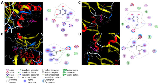 Molecular docking was performed on the nine core targets and nine key active components obtained from the previous results. The ligand-receptor binding energy of MOE 2019.0102 is negatively correlated with the affinity. A target-to-target score of less than −7 kcal/mol indicates that the corresponding compound has a high binding ability with the target [17]. Finally, chlorogenic acid, caffeic acid, gallic acid and lutein were screened for further analysis with BRCA1 (PDB ID:1LOB), CASP3 (PDB ID:7RN7), NFKBIA (PDB ID:1IKN) and VEGFA (PDB ID:1MGV). The binding sites and binding forms between compounds and targets are shown in Table 2. As shown in Figure 7A,B, two different conformations of chlorogenic acid bound to BRCA1 through H-acceptor bonds at the lysine C145 binding site, and in Figure 7C, chlorogenic acid bonded to NFKBIA through H-donor at the glutamic acid D138 binding site. Caffeic acid bonded to CASP3 at the lysine B242 binding site in Figure 7D. Luteolin bonded to BRCA1 through H-acceptor bonds at the lysine C145 binding site in Figure 7E. In Figure 8A, gallic acid forms an H-acceptor bond with CASP3 at the lysine binding site. Figure 8B shows that gallic acid formed an H-donor with NFKBIA at the glutamate binding site. Figure 8C,D shows two different conformations of gallic acid bonded to VEGFA through H-donor and H-acceptor bonds at glutamate A64 and lysine A48 binding sites. These results suggested that the four compounds might exert their inhibitory effects on HUA by targeting corresponding targets.