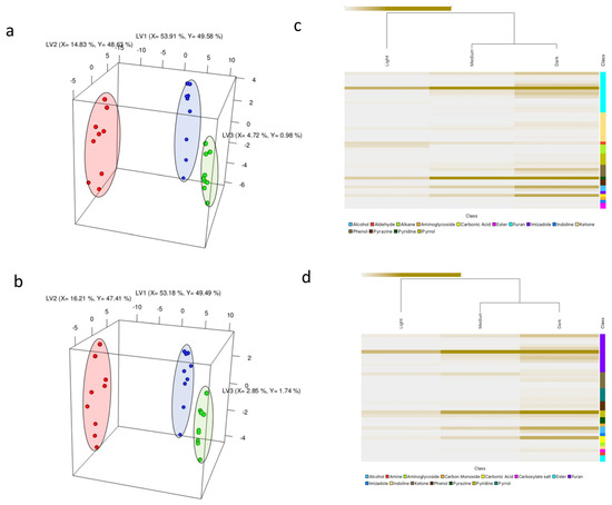 PLS-DA score plot illustrating volatile changes during the roasting process of Arabica coffee beans sourced from Ethiopia (a) and Congo (b), encompassing nine sample replicates of light (green), medium (blue), and dark (red) roasts. The respective axes indicate the explained variance for each latent variable (LV). Heatmaps showcasing scaled intensities of VID-selected discriminant volatile compounds (>0.9) across light, medium, and dark roasts are presented in (c) for Ethiopia and (d) for Congo. Intensely colored regions indicate higher compound concentrations.
