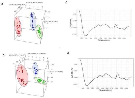 Figure 2c,d illustrates the loadings and associated wavelengths for discriminating the roast degrees. Both geographical origins show similar loading plots for LV1, indicating that the 500–1000 nm wavelength region plays a significant role in the model and is important for differentiating the roast degrees of these coffee samples. This region corresponds to the visible wavelength range (400–800 nm) and includes structural overtones and combinations. The wavelength range of 700–950 nm in the NIR spectrum can be attributed to the 3rd overtone region, which encompasses C-H, H2O, R-OH, and R-NH overtone bands [26].