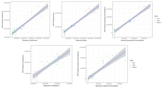 The relationship between peak areas (for representative volatile compounds) and the NIR predicted values. Roast degrees are depicted by color: light (green), medium (blue), and dark (red). The blue lines represent the best-fit line, and the gray ribbons indicate uncertainty intervals.