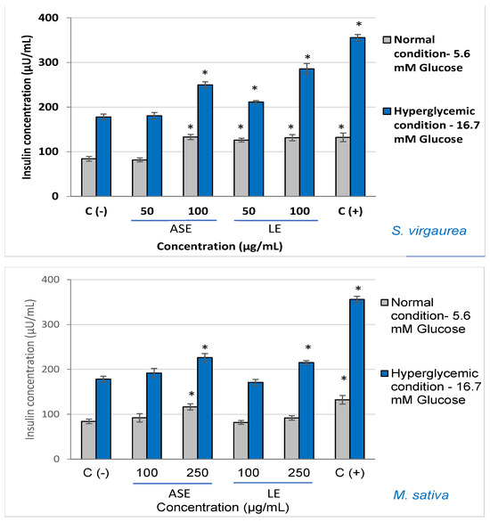 Likewise, similar results of the effectiveness of stimulating insulin secretion were also obtained in hyperglycemic conditions (16.7 mM). Thus, the best results were obtained after the treatment with S. virgaurea concentrated extract obtained after ASE extraction at 50 µg/mL (~249 µU/mL), S. virgaurea concentrated extract obtained after LE extraction at 100 µg/mL (~286 µU/mL), and M. sativa extracts 250 µg/mL; for the stimulated and untreated control, the secreted insulin concentration was ~178 μU/mL. Alanine was used as a positive control, demonstrating its ability to significantly stimulate insulin secretion.