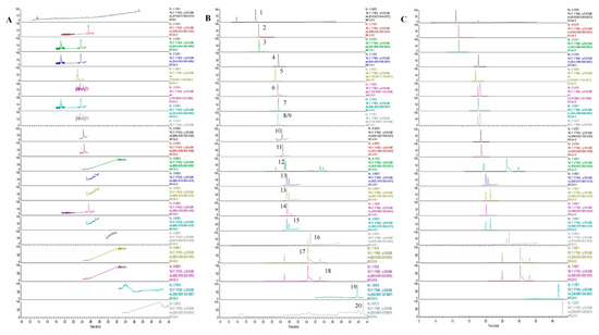 Extracted ion chromatogram of the 20 compounds. (A) Blank lung tissue samples; (B) lung tissue samples collected at 0.083 h after administration of PG–OJ; (C) blank lung tissue spiked with analytes. (1: Notoginsenoside R1, 2: Ginsenoside Re, 3: Ginsenoside Rg1, 4: 24(R)-pseudoginsenoside F11, 5: Ginsenoside Rb1, 6: Ginsenoside Rc, 7: Ginsenoside Rf, 8: Ginsenoside Rb2, 9: Ginsenoside Rb3, 10: Pseudoginsenoside RT5, 11: Ginsenoside Ro, 12: Ginsenoside Rg2, 13: Ginsenoside F1, 14: Ginsenoside Rd, 15: Ginsenoside Rh1, 16: Ginsenoside Rg5, 17: Ginsenoside Rg3, 18: Ginsenoside F2, 19: Methylophiopogon flavanone A, 20: Methylophiopogon flavanone B).