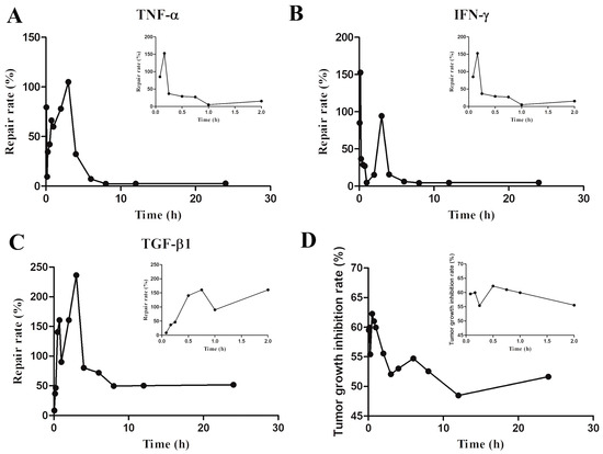 Pharmacodynamic indicator for changes in tumor-bearing mice after oral administration of PG–OJ extract at different time points. Main (A–C) present the average repair-rate changes of three cytokines (TNF-α, IFN-γ and TGF-β1) in the lung tissue of six mice in the PG–OJ group within 24 h, while the secondary figure shows the average changes within 2 h. (D) primarily illustrates the average tumor-growth-inhibition-rate changes within 24 h and 2 h for the same group of six mice in the PG–OJ group.