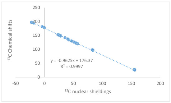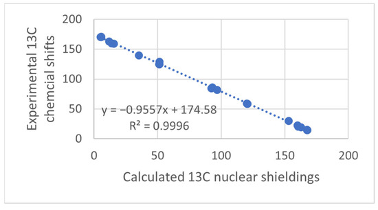 Plot of experimental 13C chemical shifts vs. calculated 13C nuclear shieldings keto-enol forms of 1-(n-pyridinyl)butane-1,3-diones. Taken from Ref. [28]. Copyright Wiley 2023.