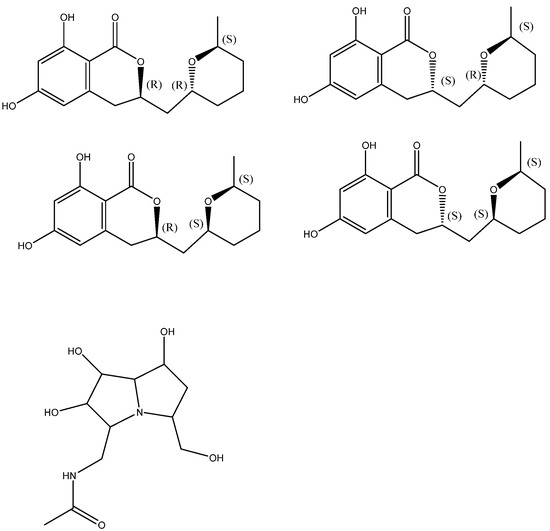 The stereochemical assignment of cladosporin was demonstrated. It has three stereocenters featuring 3R, 10R, and 14S absolute configuration (see Figure 5). The four cladologs shown in Figure 5 were calculated and 13C chemical shifts were measured. It was fond that chemical shift differences between pairs of carbons gave better results and the parameter Mean Average Error, MAEΔΔδ, was used for the evaluation of the six sets of data comparing the calculated and experimental data. MAEΔΔδ = Σ(ΔΔδ)/nΔΔδ. Σ is the summation of n computed Δδ absolute error values (ΔΔδ) normalized to the number of ΔΔδ errors considered (nΔΔδ) [22]. The method was also tested successfully on pochonicine (Figure 5 below) with four chiral centers.