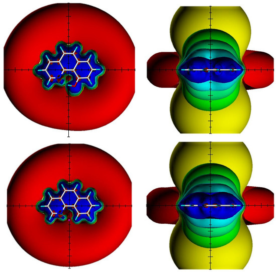 Visualization of the spatial magnetic properties (TSNMRS) of 10-hydroxybenzo[h]quinoline (above) and benzo[h]quinoline (below) as ICSS of different direction and size (blue represents 5 ppm shielding, cyan 2 ppm shielding, green-blue 1 ppm shielding, green 0.5 ppm shielding, yellow 0.1 ppm shielding, and red −0.1 ppm deshielding). The pink dot in the top view of benzo[h]quinoline shows the position of the OH atom in 10-hydroxybenzo[h]quinolone. Taken from Ref. [48]. Copyright Elsevier 2018.