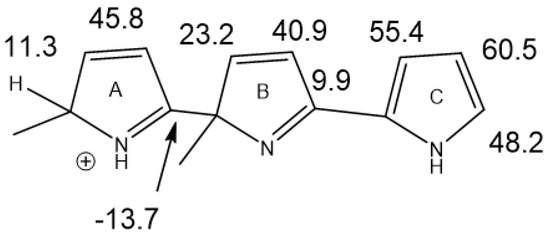 The treatment of alkylpyrroles, e.g., kryptopyrrole, may also lead to trimers. Leaving the reaction mixture for a while leads only to one species, as shown in Figure 24. Chemical shifts were calculated based on the values of a scaffold (Figure 25) and substituent effects were calculated based on monomers. A very decent fit between the experimental and calculated values (R2 = 0.984) was obtained. It is important to realize that monomers corresponding to rings A or B cannot be synthesized. The calculated results also revealed that only ring A carried a positive charge (notice the large difference in chemical shifts between the charged and the neutral ring). This method can successfully be used for polymers.