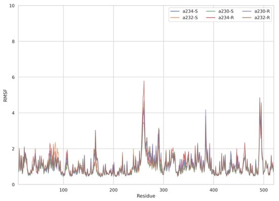 The dynamic adjustment similarity between the AChE—ACh and the AChE—OPNA systems is confirmed by RMSF calculations (Figure 4, Figure 5 and Figure 6). As can be seen, the root-mean-square fluctuations for examined systems are calculated for each residue separately (Figure 4, Figure 5 and Figure 6). The RMSF values were calculated disregarding the final five amino acids from both C- and N-termini to get rid of unnecessary fluctuations. Structural adjustments in the protein form a very similar pattern of spikes in each case and are furthermore of very similar magnitude. This allows us to presume that the protein structural folding adjusts to interact with Novichoks in the same way as with ACh and other OPNAs. This indicates that the putative Novichok working mechanism could be at least similar (if not identical) to the actual AChE—ACh mechanism.