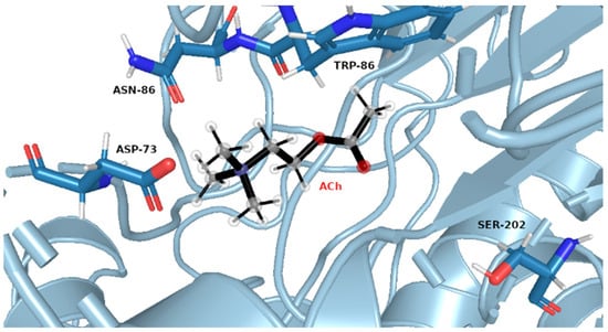 Exemplary snapshot of the most frequent structure for AChE complexes with ACh. Ser202 is shown for purely illustrative purposes.