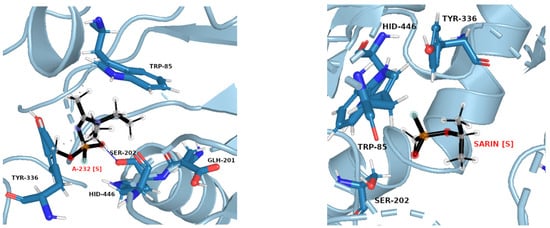 Exemplary snapshots of the most frequent structures for AChE complexes with A-232 [S] (left) and sarin [S] (right). The dashed line symbolizes hydrogen bonding.
