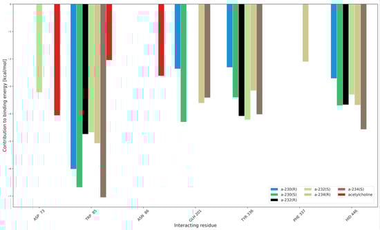 Additionally, the interaction partition analysis was performed in order to gain quantitative knowledge about how the interactions are divided between individual residues, i.e., with which amino acids the ligands interact the most. Exemplary partitioning for Novichoks is depicted in Figure 9 while Figures S33–S38 depict the amino acids and the interaction energy for the acethylcholine, Novichoks, and the remaining G- and V-series agents respectively as well as exemplary snapshots with all interacting residues common in the tier made visible.