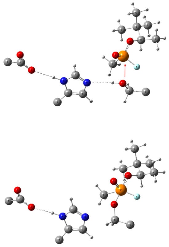 Bonding changes in the catalytic triad (GLU-HIS-SER, respectively) during the formation of a covalent bond between serine and an OPNA (here—soman). The red arrow symbolizes the nucleophilic attack of the Ser lone pair in the non-covalently bonded complex (up) leading to a pentacoordinate intermediate Ser-OPNA (low) and dashed lines symbolize hydrogen bonding. All redundant parts of the aminoacid scaffold were removed for clarity.