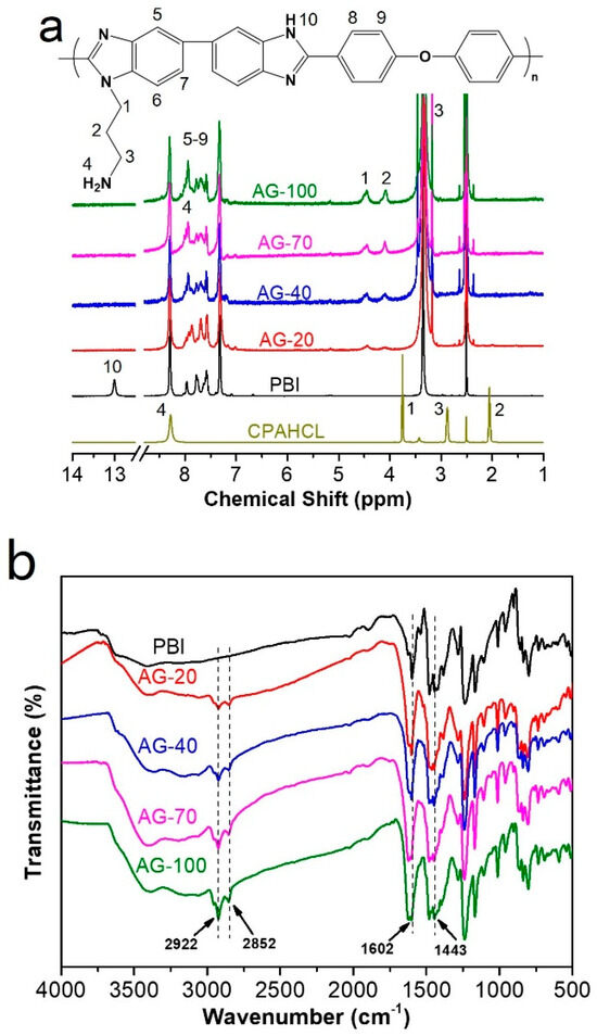 The chemical structure of original PBI and AGPBI were characterized using 1H NMR, as shown in Figure 2a. The resonance peaks of original PBI were located at 7.31–8.31 ppm (7H, 5–9) for the benzene ring and 13.0 ppm (1H, 10) for -NH- group in the imidazole ring, respectively [40]. The response peak at 2.50 ppm is attributed to DMSO solvent. For AGPBI, the four newly appeared resonance peaks at 4.08 (2, 2H), 3.16 (3, 2H), 4.45 (1, 2H) and 7.94 (4, 2H) ppm, attributed to the chemical shift of CPAHCL segments, and the disappearance of the resonance peak of -NH- at 13.0 ppm, indicate the successful synthesis of AGPBI. In addition, the intensity of resonance peaks attributed to the side chain increased with the increase in the grafting degrees (GDs) of AGPBI, and the GD can be calculated by the peak area ratio of the side chain and main chain of AGPBI according to the following equation: