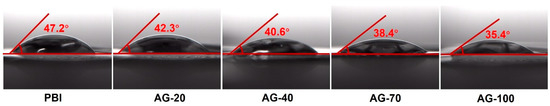 The PA contact angle measurements were carried out to investigate the affinity of the PBI and AGPBI membrane with PA as show in Figure 3. It is apparent that the contact angle of the AGPBI membranes was lower than that of the original PBI membrane, suggesting that the introduced basic side chain enhances their affinity with PA. Moreover, the contact angle continuously decreased with the increase in GD.