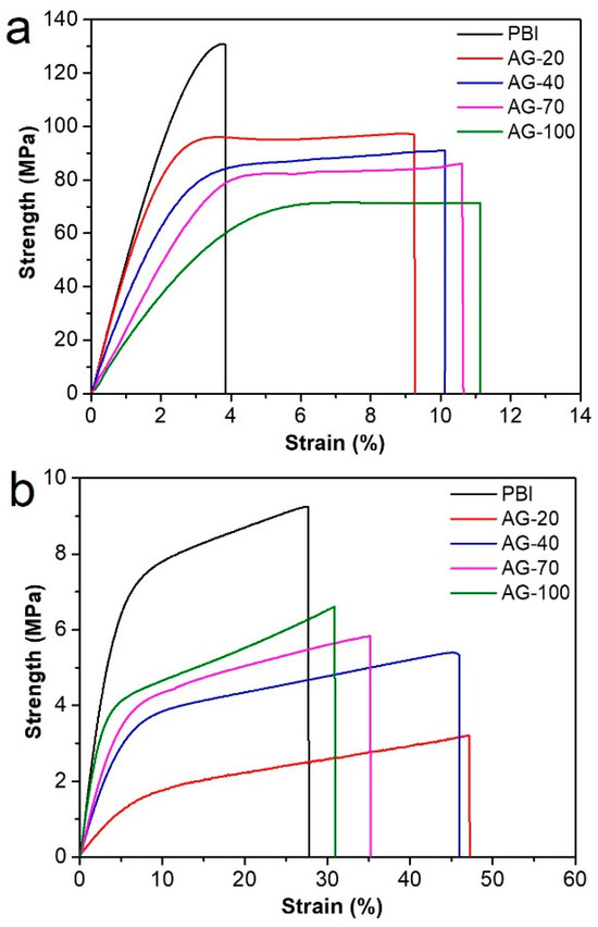 Stress–strain curves of undoped (a) and PA-doped (b) membranes.