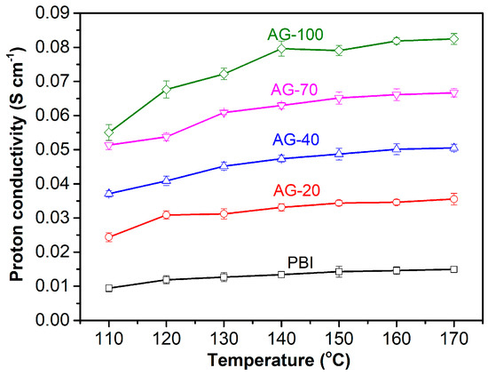 Proton conductivity is one of the key parameters of HT-PEMs that directly affects the performance of HT-PEMFC. The proton conductivity levels of the PA−doped PBI and AGPBI membranes were measured at a temperature range of 110 to 170 °C under anhydrous conditions, and the results are shown in Figure 5. It is apparent that the proton conductivity of all the tested membranes increased with the increase in both temperature and the GD of side chains. This can be understood as the increase in operating temperature being able to accelerate the movement of protons and PA molecules, while the increase in GD leads to an improvement in PA uptake. For example, the proton conductivity of the AG-70 membrane increased from 0.051 to 0.067 S cm−1 with an increasing temperature from 110 to 170 °C. The anhydrous proton conductivity also increased from 0.015 S cm−1 for the PA−doped PBI to 0.082 S cm−1 for the PA−doped AG−100 membrane at 160 °C, caused by the enhanced PA uptake.