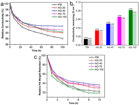 The PA leaching test, conducted by immersing the membrane in water, was also performed to evaluate the PA retention ability of AGPBI under humidity conditions, as shown in Figure 6c. It can be observed that the PA loss rate of all the membranes in water was much higher than that at 160 °C, while the AG−40 membrane still exhibited the lowest PA weight loss. The AGPBI membranes all showed a better PA retention ability than the original PBI membrane except for the AG−100 membrane, possibly due to its excessive free PA uptake. After 10 h treatment in water, the PA weight remaining of the prepared membranes was 22.9% for PBI, 29.7% for AG−20, 36.4% for AG−40, 31.8% for AG−70 and 18.7% for AG-100, respectively.