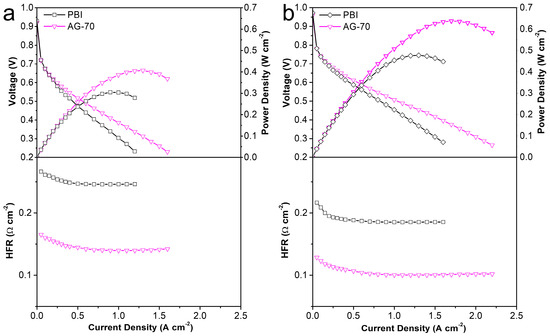 Polarization, power density, and high-frequency resistance curves of MEAs assembled from PA-doped PBI and AG-70 membranes at 160 °C under a backpressure of 0 (a) and 200 kPa (b).