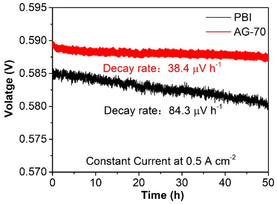 Compared to conductivity stability, the durability of a single fuel cell can better reflect the practical application stability of HT−PEMs. Durability tests of the PBI and AG−70 membranes at 160 °C at 0.5 A cm−2 under back pressures of 200 kPa were performed, the results of which are shown in Figure 8. After continuous operation for 50 h, the output voltage of a single HT−PEMFC assembled with an AG-70 membrane was slightly reduced, with a relatively low decay rate of 38.4 μV h−1, which is significantly lower than the value of 84.3 μV h−1 of the PBI-assembled single cell, indicating its practical application potential in highly stable HT−PEMs.