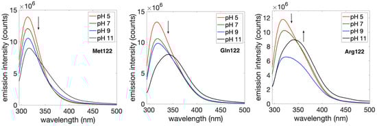 Fluorescence spectra of 60 µM solutions of His107Tyr109(Met/Gln/Arg)122 azurins in 50 mM sodium phosphate buffer at the given pH values. The excitation wavelength was 280 nm. All samples were deoxygenated, and data were collected under a N2 atmosphere. The arrows indicate intensity changes as pH is increased. A figure showing spectra at all pH values is given in the Supporting Information (Figure S2).