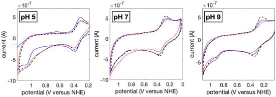 Examples of cyclic voltammograms 60 µM His107Tyr109(Met/Gln/Arg)122 azurins at pH 5, 7, and 9 in 100 mM NaOAc solutions. The blue solid line shows the Met122 variant, the red dotted line shows the Gln122 variant, and the black dashed line shows the Arg122 variant.