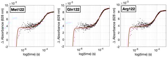 The modified proteins were characterized by mass spectrometry and UV-visible spectroscopy, both of which showed successful Ru attachment at His107. The rates of Cu(I) oxidation were determined using time-resolved laser spectroscopy to monitor the reaction of flash-quench-generated Ru(III) oxidants, as previously described [19,27,34,37,39]. Briefly, the irradiation of the Ru(II) photosensitizer affords an electronically excited state (*Ru(II)) that is oxidized by an added Ru(NH3)63+ electron acceptor to yield the protein-tethered Ru(III) oxidant. Because *Ru(II) is emissive, a bleach in absorbance is observed at short times in the kinetics traces for Cu(I) oxidation as shown in Figure 4 (additional traces are in the Supporting Information, Figures S10–S16). A reaction sequence showing all steps is provided in the Supporting Information (Figure S17). The rate constants for Cu(I) oxidation are set out in Table 3.