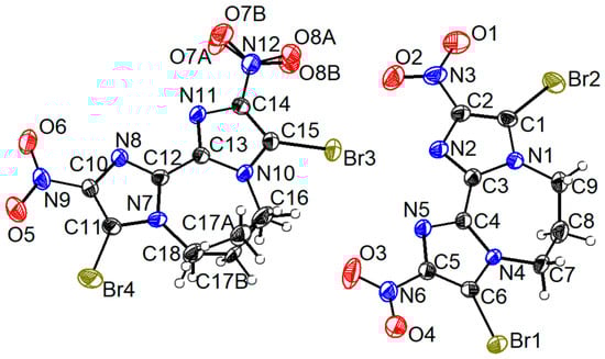 Low mechanical sensitivity and high thermal stability are essential safety indicators for energetic materials. The physical properties of a high density can secure the application of energetic materials. There has been an increased recognition that more attention needs to be paid to the combination of low mechanical sensitivity, high thermal stability, and high density. Energetic materials with fused rings, a unique class of large conjugated structures containing two or more rings sharing two atoms and bonds between the rings, have been identified as promising contenders to traditional energetic materials [3]. Fused ring energetic compounds are important skeletons for the future design of novel energetic compounds due to their conjugated planar structures that can effectively increase the density and molecular stability of the compounds with good thermal stability and low sensitivity [4]. The appearance of fused rings and the increase in the number of rings affect the value of the electrostatic potential in the central region of the surface of the explosive molecule, which is related to the sensitivity of the energetic materials [5]. They improve the safety of the synthesis, transfer, and storage of energetic materials. The introduction of heteroatoms is a way to increase the density of energetic materials. The Br element occurs rarely in the field of energetic materials and has a particular scarcity. Each introduction of the Br element has a positive impact on increasing the density of the compounds, e.g., 5-amino-1H-tetrazolium bromide monohydrate (5-AtHBr) has a density of more than 2.00 g/cm3, which is higher compared to the parent 5-AT [6].
