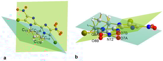 Meanwhile, the dihedral angle of the plane of O7A-N12-O8A and the plane of O7B-N12-O8B, produced by different growth orientations of the oxygen atoms on the nitro group, is 26.8°, and the dihedral angles of plane: C15-C17A-C16 and plane: C15-C17B-C16, produced by different growth orientations of the C17 atom on the alkyl bridge, are 68.0°. Their occurrence indicates the structural features of twinning crystals (Figure 2). Figure 3 demonstrates the presence of extensive hydrogen bonding within the crystal. Neighboring planar layers are ordered in opposite directions and stacked together in the crystal space (b axial view) in Figure 4.