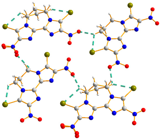 In order to investigate the molecular interactions, non-covalent interaction (NCI) analysis was performed on compound 2 with the Multiwfn v3.8 and VMD v1.9.2 [13,14,15,16,17]. The NCI analysis of the compound is illustrated in Figure 5. Red electron stacks representing site-blocking effects are present within the seven-membered ring and the imidazoles. There are some blue-green dotted high-density electron stacks representing hydrogen bonding generation between the hydrogen and oxygen atoms. The one-half orange and one-half green color of the isosurfaces near the bromine atoms represents the combination of site-blocking effects and hydrogen bonding. Halogen bonds can be observed between Br and N atoms (N from the imidazole ring) and between Br and O atoms. Halogen bonds are weak intermolecular interactions similar to hydrogen bonding and have a wide range of applications in many fields, such as molecular recognition and crystal engineering. They can have a positive effect on the design of new energetic materials with reduced susceptibility to explosions [18]. The extensive hydrogen bonding and interaction forces in the compound suggest stability.