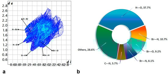 The 2D fingerprint plot drawn using the software CrystalExplorer 17 [19,20] is presented in Figure 7a, and the atomic contact ratio percentage plot derived based on the data is shown in Figure 7b. As can be seen from the plots, the H---O contact pair and Br---H contact pair possess 37.7% and 10.7% contact percentages, respectively, which confirm that these two hydrogen bond contact pairs have the highest atomic contact ratio. Those data confirm that H---O and Br---H hydrogen bond contacts are essential forces in the interaction and support of low mechanical sensitivities. In addition to these hydrogen bonds, other interactions are reflected in the different contact pairs in these plots. Halogen bonds are also reflected in the 2D fingerprint plot and atomic contact percentage contribution plot. The proportion of Br---O contact pairs (9.2%) is higher than that of Br---N (8.3%).