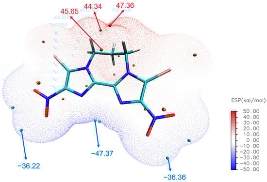 The electrostatic potential diagram [21] of compound 2 is plotted in Figure 8 to understand the potential distribution of the compounds. The blue region represents the negative potential region, and the red region represents the positive potential region. The white region represents the potential that tends to zero. The positive potential regions of compound 2 are concentrated near the seven-membered ring. The positive values of the electrostatic potential above the front region of the bromine atoms and maximum value around the bromine atoms are 34.02 and 34.20 kal/mol, respectively. The negative potential regions are concentrated near the nitro group. Values of electrostatic potentials above the central regions of the molecular surface are strongly related to the sensitivities of energetic molecules [18]. The electrostatic potential above the center region of the molecular surface is in the white region in the figure, which indirectly supports its low mechanical sensitivity. In energetic compounds, more extensive areas with positive potentials usually result in increased impact sensitivities [22]. The highest positive potential (47.36 kal/mol) almost coincides with the absolute value of the lowest negative potential (−47.37 kal/mol), and the positive and negative distribution of the potential area region is more uniform (positive potential area percentage: 39.2%; negative potential area percentage: 60.8%). A lower percentage of the positive potential region and the uniform potential distribution benefit the formation of low mechanical sensitivity [23].