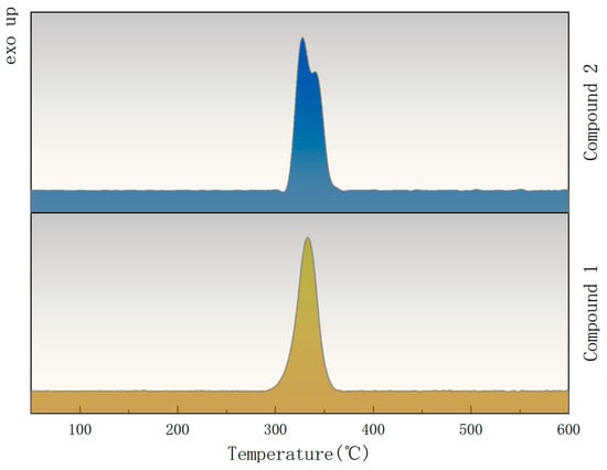 The thermostability of compound 1 and 2 was measured by the differential scanning calorimetry (DSC) to explore their applications. It is an analytical method that measures the energy difference between the specimen and the reference as a function of temperature under programmed temperature increase. The tested compounds were heated in an aluminum trioxide crucible at 5.0 K/min under nitrogen protection with a nitrogen flow rate of 50 mL/min. The onset of decomposition temperatures of compound 1 and 2 are 292.4 °C and 311.3 °C (Figure 9), respectively. They are higher than the onset of decomposition temperature of 290 °C for trinitrotoluene (TNT) [24,25], a conventional explosive. The peak decomposition temperatures of compound 1 and 2 were 332.8 °C and 328.2 °C, respectively. The high thermal stability gives them the potential to become thermally resistant explosives.