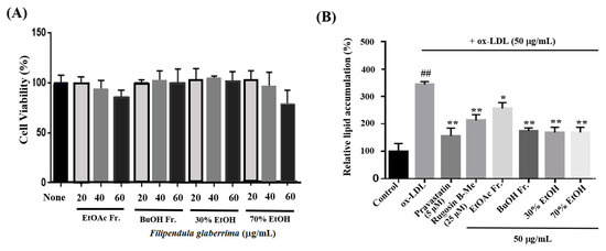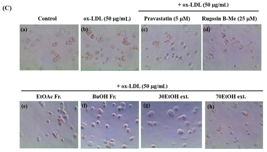 THP-1 cells (ATCC, TIB-202, Manassas, VA, USA) were obtained and maintained in RPMI-1640 medium (Cytiva, UT, USA), supplemented with 10% fetal bovine serum (FBS; Hyclone, Cytiva, Logan, UT, USA), penicillin (100 U/mL), streptomycin (100 μg/mL), and 2-mercaptoethanol (Sigma-Aldrich, Saint Louis, MO, USA) at a final concentration of 0.05 mM. The cells were cultured at 37 °C in a 5% CO2 atmosphere with humidity. The THP-1 cells in the suspension were treated with 50 nM phorbol-12-myristate-13-acetate (Sigma-Aldrich, USA) for 48 h. When the cells were attached to the plate, the medium was replaced with 1% FBS, and the starvation condition was maintained for 6 h. The cells were pretreated with pravastatin (Sigma-Aldrich, USA) and the extracts for 2 h. Ox-LDL (Invitrogen, Carlsbad, CA, USA) was treated with 50 μg/mL to form a foam cell and allowed to stand for a further 16 h.