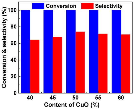 The number of Cu active sites is one of the two factors that mainly determine the catalytic performance for the dehydration of glycerol to acetol. It was reported that the catalyst with ~50% CuO exhibited the best catalytic performance [18]. Therefore, the effect of CuO content in the range from 40 to 60% on the catalytic performance of the Cu-Zr catalyst was first investigated, and the results are shown in Figure 1. The five catalysts exhibited high activity, and all the conversions of glycerol were higher than 99%. However, the CuO content affected the selectivity of acetol to a great extent. The Cu-Zr with 40% CuO showed a low selectivity to acetol, and the value was only 64.3%. Increasing the CuO content can improve the selectivity to acetol. The Cu-Zr with 50% CuO showed the highest selectivity (74.0%) to acetol. When further increasing the CuO content, the selectivity decreased. When the CuO content increased to 60%, the selectivity decreased to 70.6%.