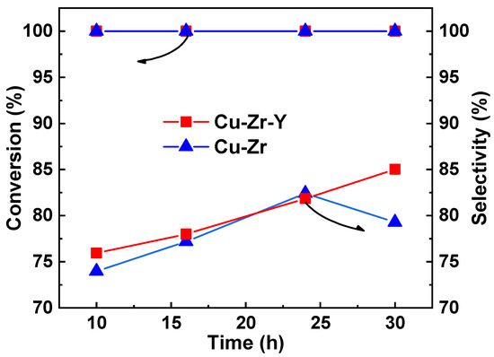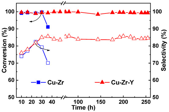 The stability of the Cu-Zr and Cu-Zr-Y catalyst. Conditions: temperature = 220 °C, LHSV = 0.45 h−1.