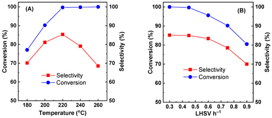The effect of temperature (A) and LHSV (B) on the catalytic performance of Cu-Zr-Y.