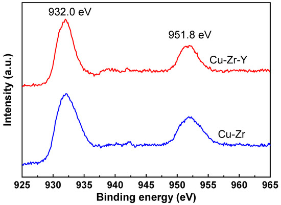 Figure 8 shows the XPS results of the Cu-Zr and Cu-Zr-Y catalysts reduced by H2 at 300 °C for 2 h. It can be seen that the two catalysts exhibited very similar XPS patterns, where two peaks at 932.0 and 951.8 eV were observed over both catalysts. It was reported that both Cu0 and Cu+ gave signals at ~932.0 and ~951.8 eV, and it is hard to discriminate Cu0 and Cu+ [25]. The XRD results, shown in Figure 6, suggested that the Cu species of the reduced Cu-Zr and Cu-Zr-Y was mainly present in the form of Cu0, and no CuO2 was detected. Therefore, we inferred that the peaks at 932.0 and 951.8 eV was mainly attributed to Cu0. The H2-TPR results in the following will further confirm this supposition.