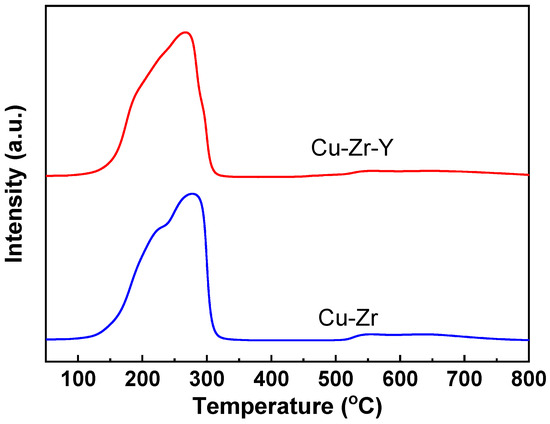 The H2-TPR results of the Cu-Zr and Cu-Zr-Y catalysts.