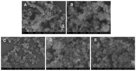 The SEM images of Cu-Zr and Cu-Zr-Y before and after reaction. (A): the reduced Cu-Zr; (B): the Cu-Zr after a 30 h reaction; (C): the reduced Cu-Zr-Y; (D,E): the Cu-Zr-Y after a 30 h and 250 h reaction.