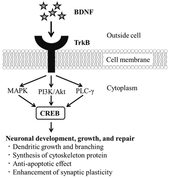 Brain-derived neurotrophic factor (BDNF) is a key molecule expressed in the central nervous system and intestines of humans and rodents and is involved in plastic changes related to learning and memory [18]. Changes in BDNF protein expression are associated with the onset of neurodegenerative diseases, such as dementia. BDNF promotes neuronal formation and growth mainly by binding to tropomyosin receptor kinase B (TrkB), a specific receptor on target cell surfaces, leading to TrkB autophosphorylation and activation of signaling molecules such as cAMP response element-binding protein (CREB) (BDNF–TrkB–CREB signaling pathway, Figure 1) [19]. Many studies on the beneficial effects of foods on memory impairment using animal models, such as AD models, have evaluated their association with BDNF signaling pathway activation, that is, BDNF protein expression, pTrkB/TrkB ratio, and pCREB/CREB ratio [20,21,22]. Since BDNF expression is decreased in the hippocampal and temporal lobes of patients with AD or AD model rats, measuring BDNF, TrkB, and CREB expression levels may be useful for assessing AD progression [23,24].