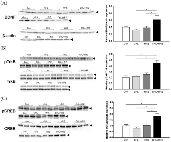 In the Con (control), CHL (Chlorella pyrenoidosa powder (200 mg/day/rat)), HRE (Halocynthia roretzi plasmalogen (0.07 mg/day/rat)), and Mix groups (CHL + HRE, Chlorella pyrenoidosa powder (200 mg/day/rat) + Halocynthia roretzi plasmalogen (0.07 mg/day/rat)), the hippocampus was excised from the brain, and BDNF signaling-related proteins expression and phosphorylation were detected by Western blotting. The hippocampal BDNF protein expression level in the Mix group was significantly higher than those in the CHL or HRE groups but showed an increasing trend compared to the Con group (Figure 2A). Moreover, the phosphorylation of TrkB, the specific receptor for BDNF, was significantly higher in the Mix group than in the Con and the CHL groups (Figure 2B). Further, phosphorylation of CREB was also significantly increased in the Mix group compared to the Con, CHL, and HRE groups (Figure 2C). These results indicate that the BDNF–TrkB–CREB signaling pathway was most activated in rats that received both Chlorella pyrenoidosa powder and Halocynthia roretzi extract.